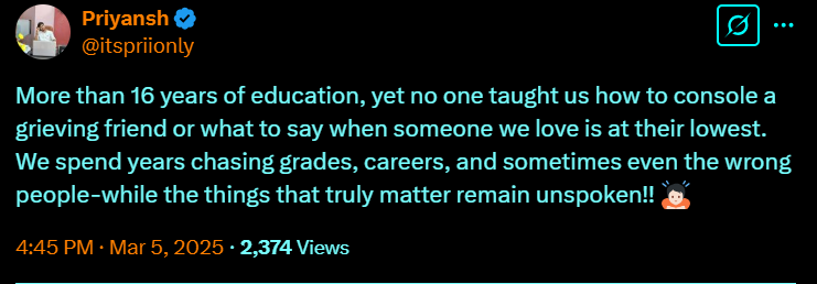 “More than 16 years of education, yet no one taught us how to console a grieving friend or what to say when someone we love is at their lowest. We spend years chasing grades, careers, and sometimes even the wrong people—while the things that truly matter remain unspoken!!”
