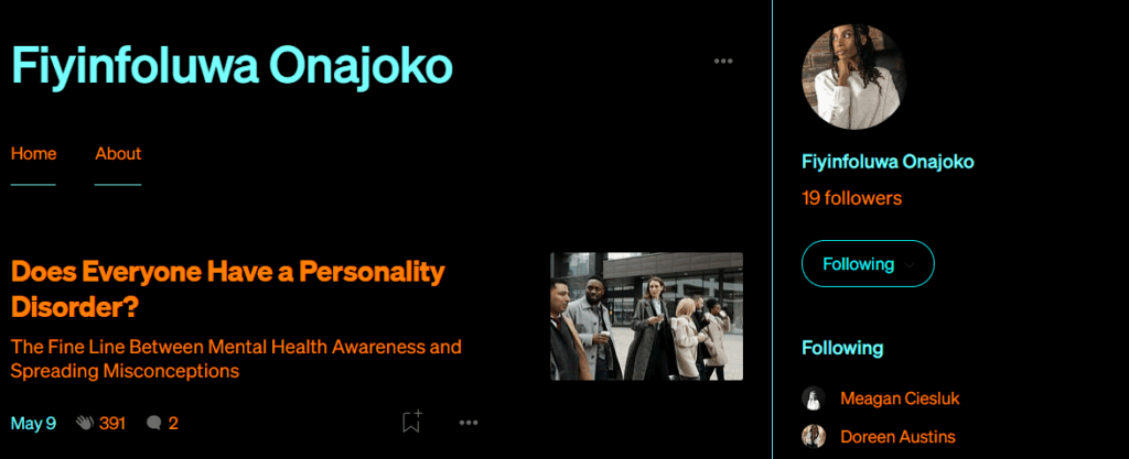 For instance, on May 9, 2025, she published an insightful article on her Medium Blog Does Everyone Have a Personality Disorder?, she addressed the blurry line between awareness and misrepresentation.