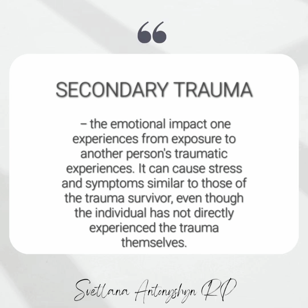 Vicarious trauma, also known as secondary trauma, refers to the emotional residue or psychological impact experienced by those who are exposed to the traumatic stories of others or who witness the aftermath of traumatic events. Over time, this repeated exposure can lead to symptoms similar to post-traumatic stress disorder (PTSD), such as intrusive thoughts, emotional numbing, and hyperarousal, even though the person has not directly experienced the trauma themselves.