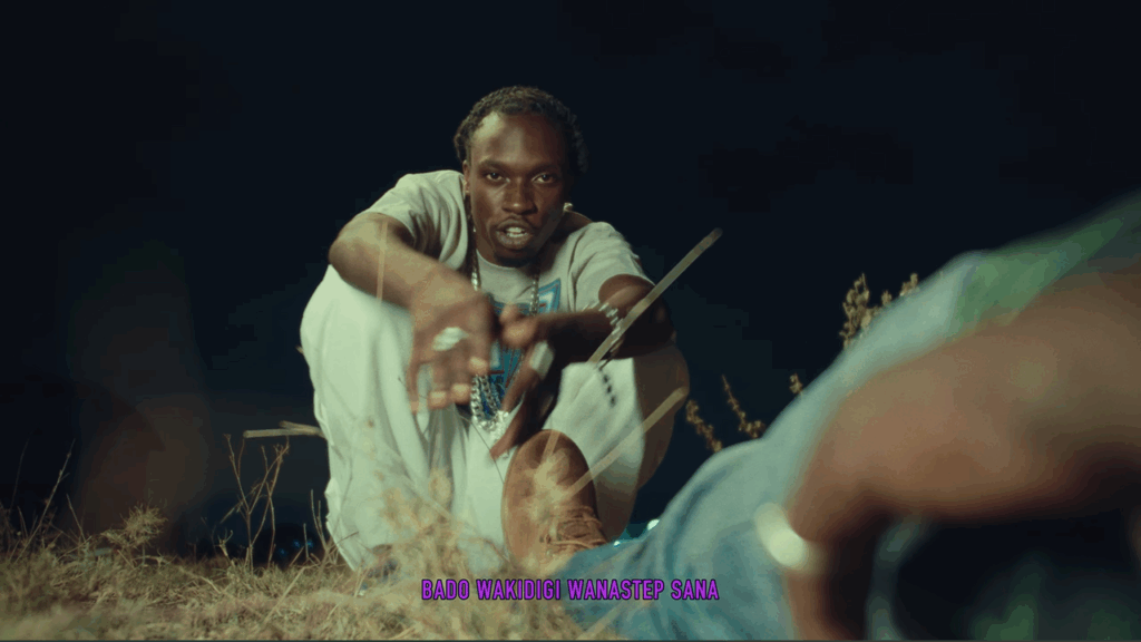 The line employs a double entendre. Figuratively, despite his chill demeanour, Toxic’s presence intimidates others, invoking fear in them. This shows a contrast in which he expects them to be calm, like he is. He follows up by saying he’s absent and doesn’t take a gift to a girl if they see each other. The “lyrically ill, positive, niko tested” line is delivered smoothly and is undisputed. In the chorus, he warns rivals to “step quickly” and retreat from a lyrical or street battle, or face defeat. He boasts of metaphorically knocking them out in broad daylight, showcasing his bold dominance: “Step sana, mangumi ka nguo tunavaana / bishana, knock- knock- knockout mchana, tulijuana ju ya kuvurugana“