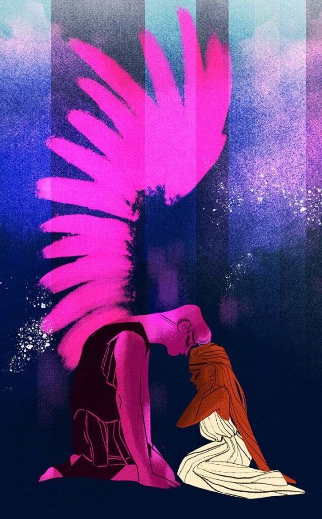 Meanwhile, Eros had recovered from his wound, but not from his heartbreak. He had watched Psyche’s trials from afar, his love for her growing stronger with each act of courage, each proof of her devotion. When he saw her fall into deathly sleep, he could bear separation no longer. Flying on swift wings, he reached Psyche’s motionless form and gently wiped the sleep from her eyes, returning it to the box. His kiss awakened her, and his tears of joy fell like rain on her face.